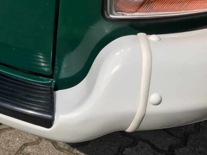 Wolkenweißer Keder zwischen dem Stoßstangenmittelteil und den Stoßstangenecken beim Typ-2 Bus (T2).