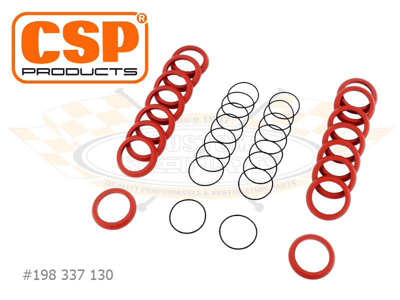 Dichtsatz für unsere CSP Products Stößelschutzrohre für Typ-1 30PS und Porsche 356/912 Motoren. Der Satz enthält die Stößelschutzrohrdichtungen für Motorgehäuse und Zylinderköpfe sowie die inneren O-Ringe für das teleskopische Schutzrohr. Ausreichend für 8 Stößelschutzrohre.