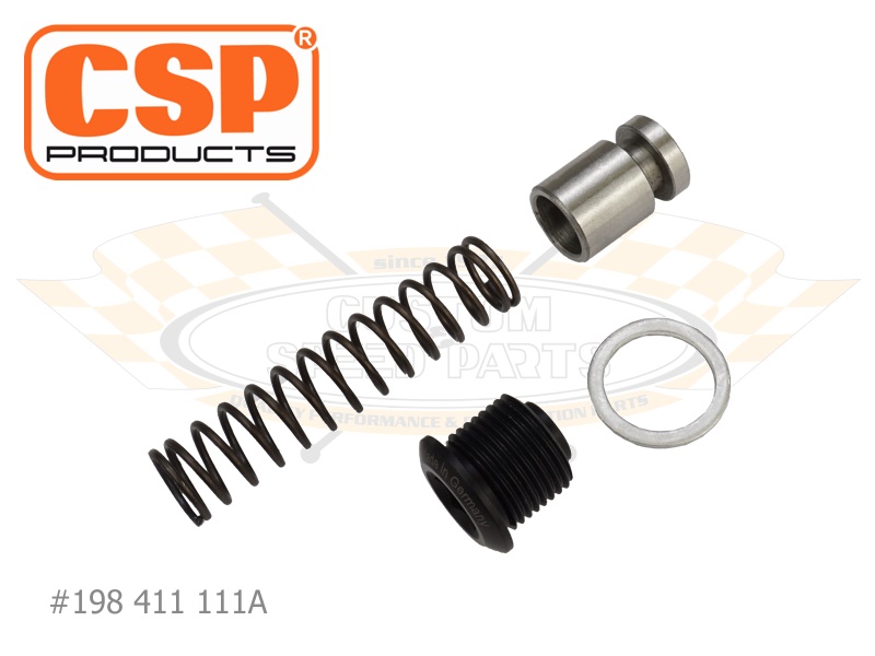 Unsere CSP Products Öldruckregelsätze werden nach originalen Spezifikationen gefertigt und entsprechen maßlich den ab Werk verbauten Komponenten, was sehr wichtig für eine einwandfreie Funktion des Ölsystems ist. Dieses Set, bestehend aus Öldruckfeder, Öldruckregelkolben (mit Nut), Verschlussschraube und Dichtring ist passend für den Typ-1 Motor 13-1600 ccm '63-'69 mit einem Regelkolben.