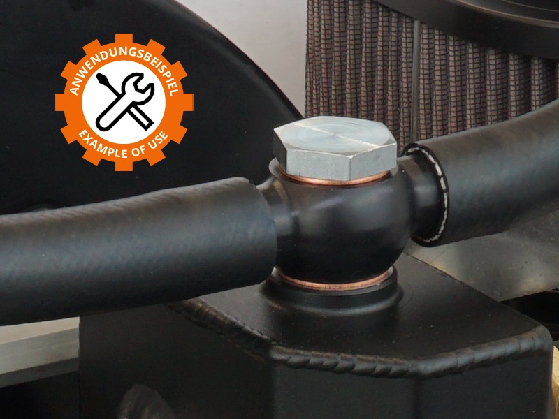 Die Aluminium Ringöse ist besonders strömungsgünstig konstruiert und mit einem Gewicht von 42 Gramm deutlich leichter als eine konventionelle doppelte Ringöse aus Stahl. Der optimierte Schlauchanschluss ermöglicht eine einfache und sichere Montage von Schläuchen mit einem Innendurchmesser von 18 mm. Durch die besondere Form der Anschlüsse ist auch eine spätere Demontage des Schlauches gewährleistet, ohne diesen zu beschädigen. Gegebenenfalls kann eine zusätzliche Sicherung der Verbindungsstelle mittels Schlauchschelle erfolgen. Die auf der Ringöse nach aussen versetzten Schlauchanschlüsse bieten zudem mehr Platz zur Anschraubfläche und ermöglichen so auch die Verwendung von Schläuchen mit größerem Aussendurchmesser.