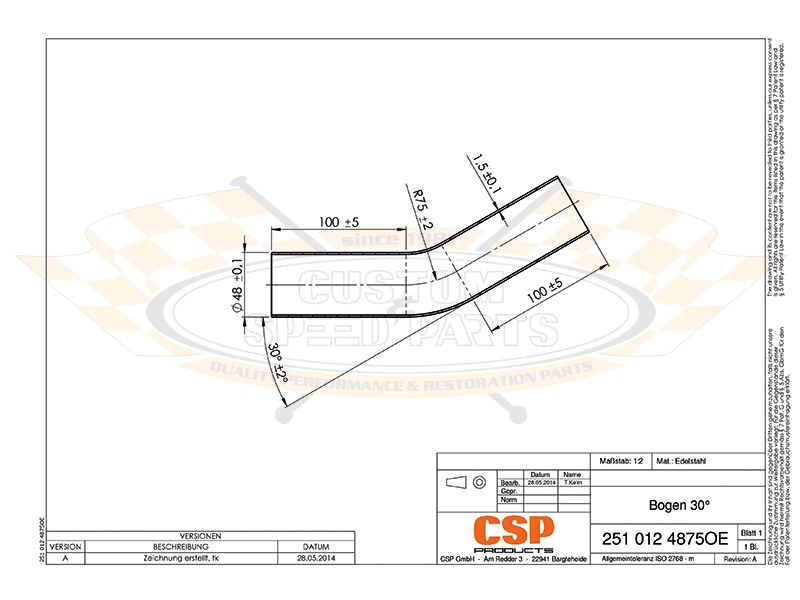 Rohrbogen 30° 48mm - Edelstahl ohne Steckmuffe 251 012 4875OE |