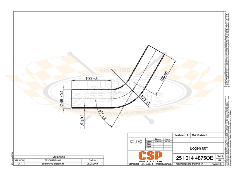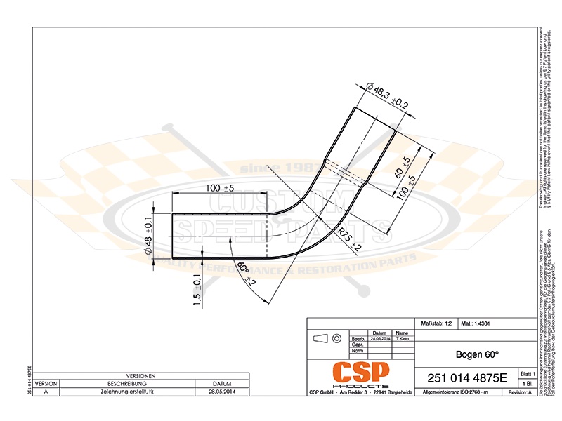 Rohrbogen 60° 48mm - Edelstahl ohne Steckmuffe 251 014 4875OE |