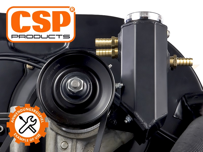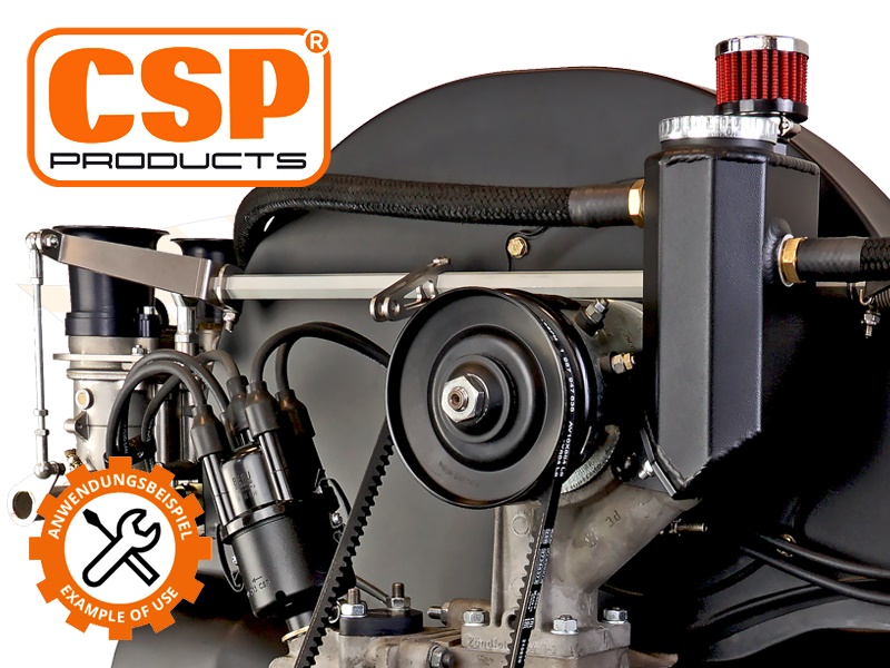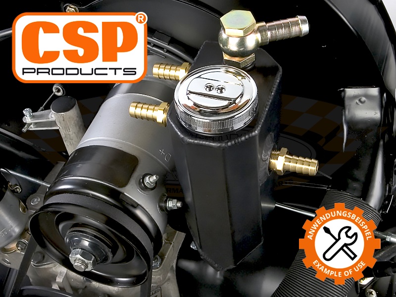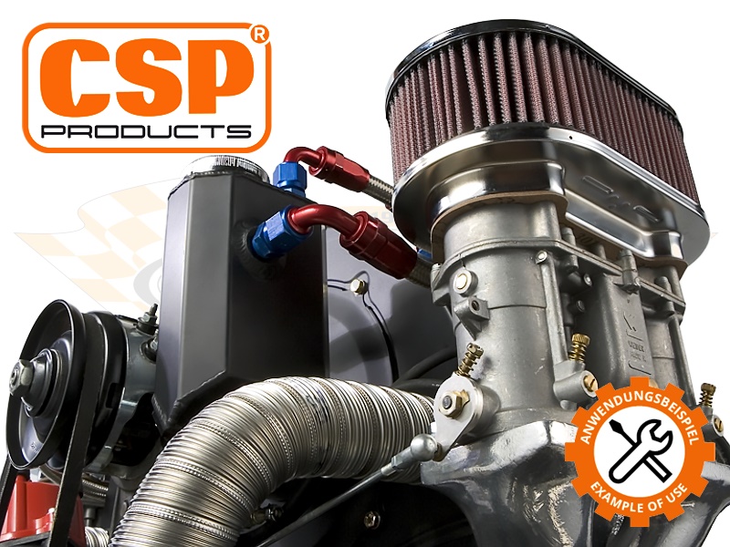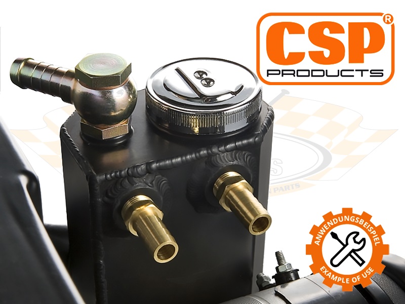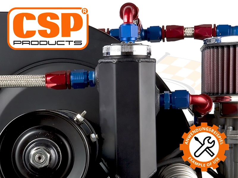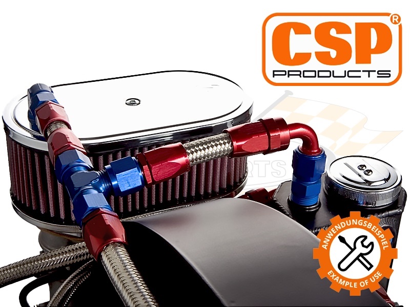 Fest verbunden mit dem Motor erfordert es kein lästiges Lösen von Schläuchen, wenn dieser aus dem Fahrzeug ausgebaut wird. Eingeschweißte Gewindebuchsen (3/8-NPT seitlich, 3/4-NPT oben) ermöglichen die Verwendung von Schlauchnippeln oder AN-Luftfahrtverschraubungen. Vorgesehen ist die zusätzliche Entlüftung der Ventildeckel, sowie der Anschluss der Luftfilter zum Absaugen der gereinigten Luft. Bei Motoren ohne Luftfilter kann einfach ein K& N Gehäuseentlüftungsfilter auf diesen Anschluss montiert werden. In Aluminium gefertigt besticht der CSP Products Entlüftungsturm durch sein geringes Gewicht und seine Formschönheit.