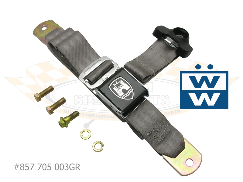 3-Punkt Sicherheitgurt mit grauem Gurtband. Erhältlich mit verchromter oder schwarzer Gurtschnalle. Die Gurte werden pro Sitz inklusive Anbaumaterial (7/16'') geliefert und sind passend für vordere und hintere Sitze im Käfer, Karmann Ghia, Typ-3/34, Kübel (Typ-181) sowie T1 und T2 Bus.