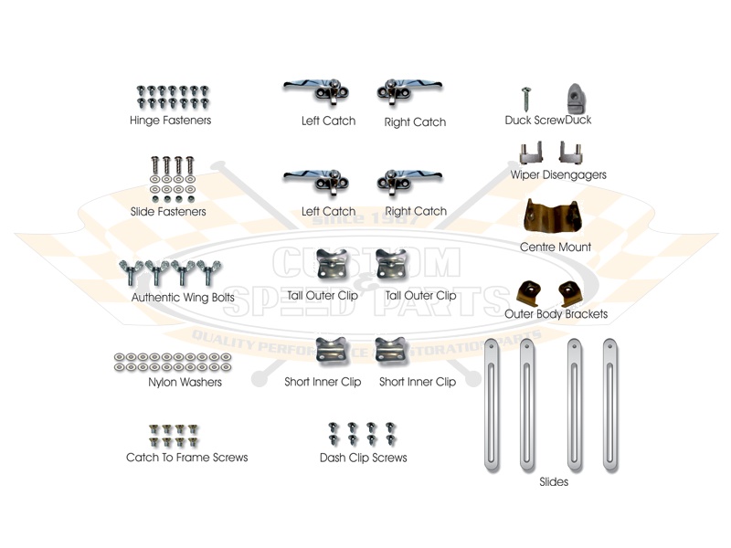 Der Satz beinhaltet Frontscheiben mit Prüfzeichen, Rahmen, teilweise aus Edelstahl gefertigte Verschlüsse, Edelstahl-Langlochschienen mit Flügelmuttern, Dichtungen, Wischerwellenaufsätze und Wischerablagebock (einäugige Ente), drei Anschweißwinkel, diverses Kleinmaterial und eine Montageanleitung.