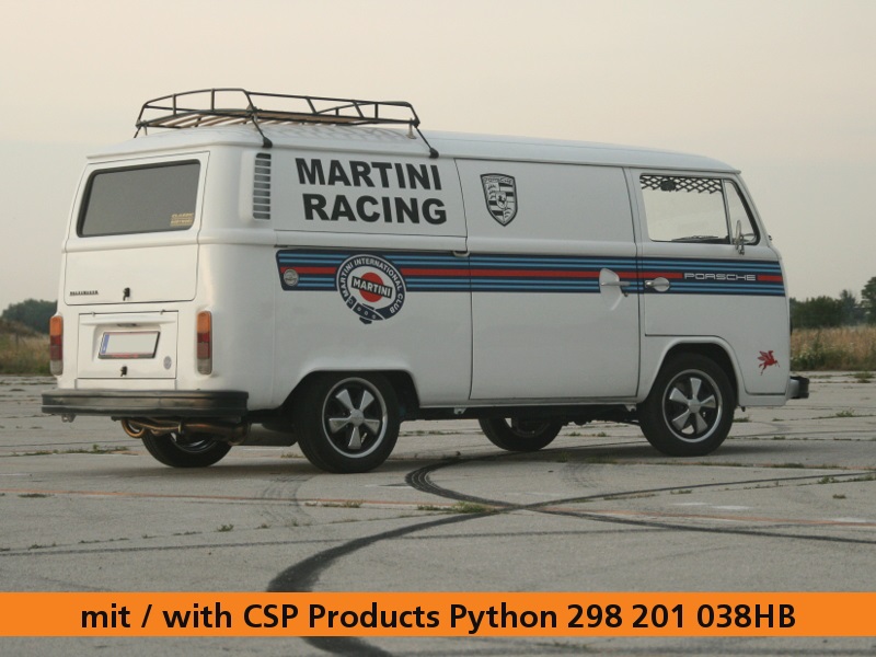 Der speziell für CSP Products hergestellte Edelstahl-Absorptionsschalldämpfer sorgt für einen dumpfen, sportlichen Klang der Anlage und einen ungehinderten Weg der Abgase ins Freie. Die Rohrführung des Schalldämpfers ist speziell für Busse von 1972 bis 1979 entwickelt worden und sorgt so für maximale Freigängigkeit des rechten Hinterrads – Platzprobleme gehören der Vergangenheit an.