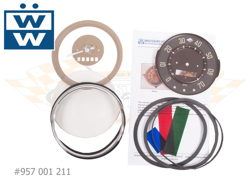 Jedes Set beinhaltet ein detailliertes und Baujahr-entsprechendes Zifferblatt, eine jeweils passende Nadel, Lichtleitfäden, Zierteile, einen verchromten Zierring sowie Dichtungen und ein Deckglas. Fünf Kits für Bullis von '55 bis '58, '58 bis '60 (70 mph), '60 (80 mph), '61 bis '62 und '63 bis '67 sind erhältlich.