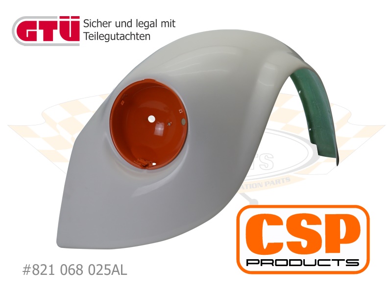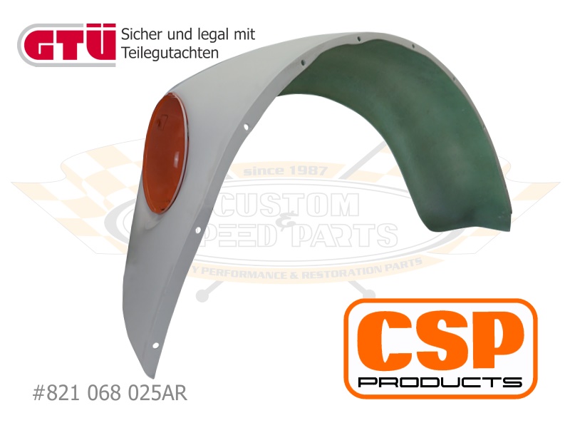 Außenverbreiterter CSP Products Kotflügel aus GFK mit einlaminierten Lampentopf und gültigem Teilegutachten. Alle Befestigungslöcher sind vorgebohrt. Löcher für Stoßstangenhalter, Hupenziergitter oder Blinker sind nicht vorhanden.