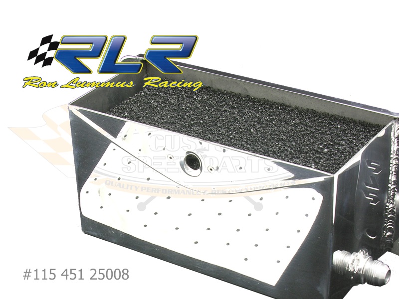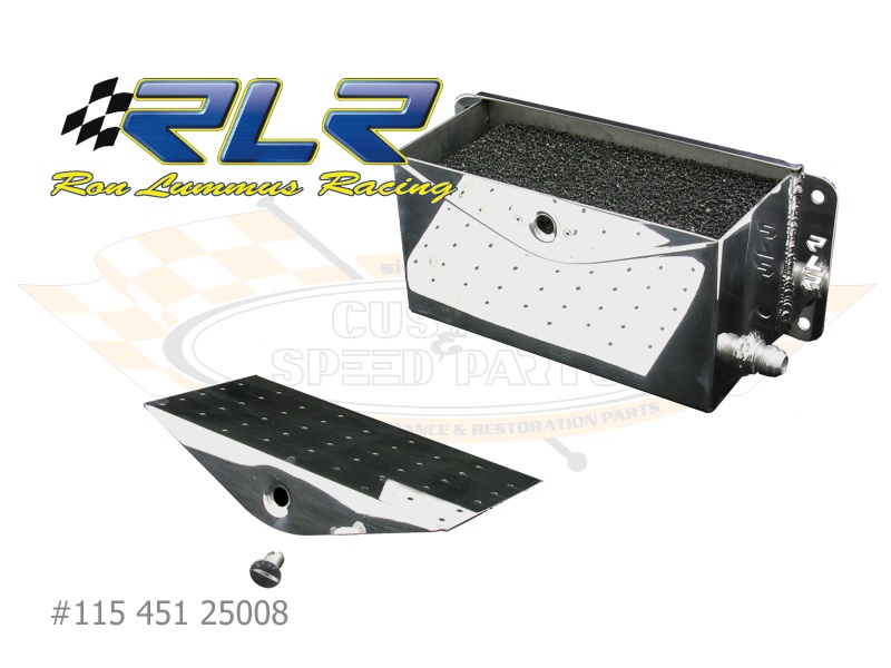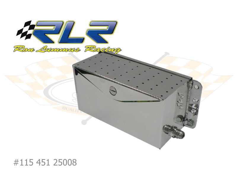Für den Einsatz in Rennwagen mit großvolumigen, hoch drehenden Motoren ist diese hochwertige Gehäuseentlüfterbox von Ron Lummus Racing gedacht. Sie besteht aus poliertem Aluminium, verfügt wahlweise über drei #08 oder #10-Anschlüsse und hat ein Fassungsvermögen von 2,5 Litern. Die Abmessungen ohne die seitlichen Haltelaschen betragen (L x B X H) 225 x 105 x 120 mm.