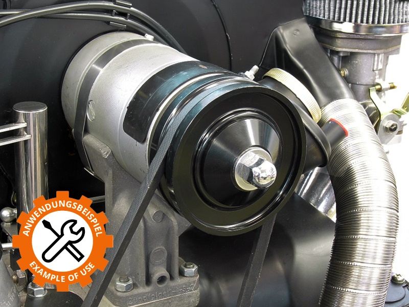 Die Einstellung der Keilriemenspannung erfolgt weiterhin über Einstellscheiben, die ebenso wie eine verchromte Befestigungsmutter im Lieferumfang enthalten sind. Sie ist nicht passend für 6 Volt Lichtmaschinen und Porsche 356 Lichtmaschinen mit 90 mm Durchmesser.