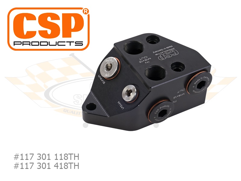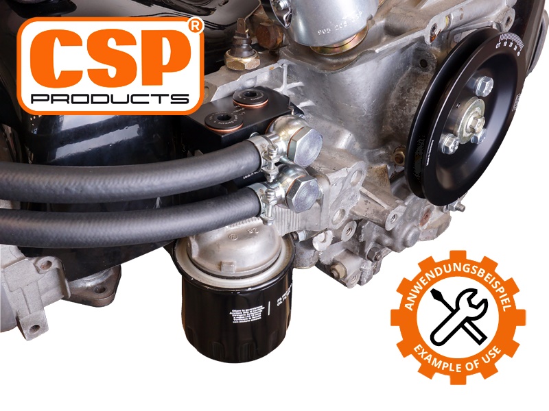 Der CSP Ölkühleranschluss mit Thermostat zeichnet sich durch seine ausfallsichere Konstruktion aus. Mit Hilfe eines Thermostats im Inneren wird die Zeit zur Erreichung der Öl-Betriebstemperatur optimiert. Über das Thermostat kann der Ölfluss durch den Kühler reguliert werden. Im kalten Zustand ist der interne Bypass offen. Das Öl sucht sich den Weg des geringsten Widerstandes und fließt in diesem Fall ungekühlt zurück in den Motor. Ab einer Temperatur von 75 Grad Celsius beginnt der Bypass sich zu schließen. Ab 82 Grad ist der Bypass verschlossen, wodurch das Öl komplett durch den Ölkühler fließt.