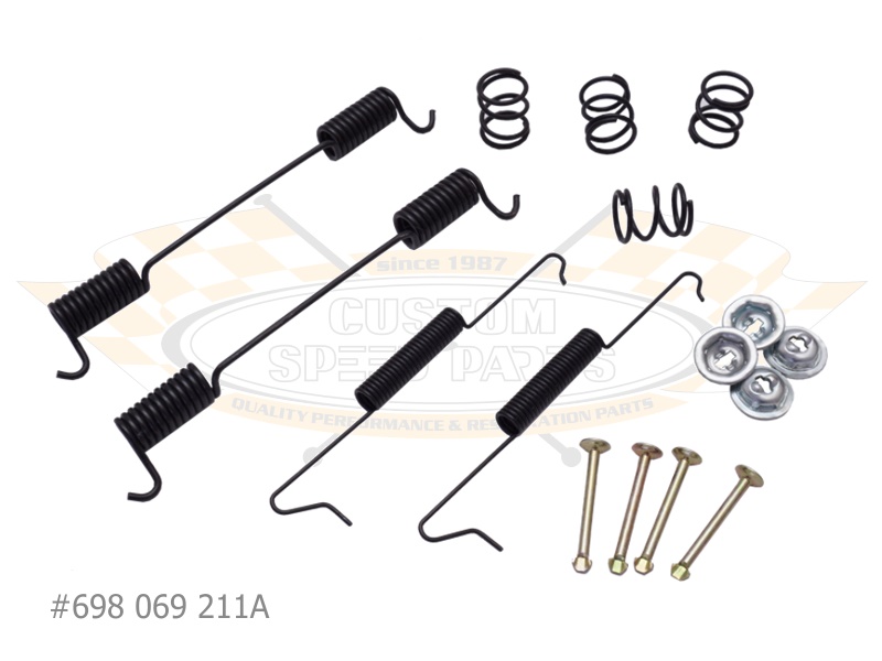 In diesem Anbausatz für die Bremsbacken der hinteren Trommelbremse von VW Typ-2 Bus (T1) von '64 bis '67 sind alle notwendigen Federteller, Spannstifte, Druckfedern und Rückholfedern enthalten.