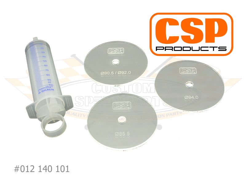 Mit diesen Meßkits ist ein einfaches Ermitteln des Brennraumvolumens von Typ-1 oder Typ-4 Zylinderköpfen möglich. Geliefert werden diese Sätze jeweils mit einer Spritze (100 ml) und 3 Meßscheiben. Das Typ-1 Meßkit wird mit Scheiben für 85,5, 90,5/92 und 94 mm Bohrung geliefert. Der Typ-4 Satz enthält Scheiben für 93 mm (1700ccm), 93 (1800ccm)/94/96 mm und 103/105 mm Bohrung.